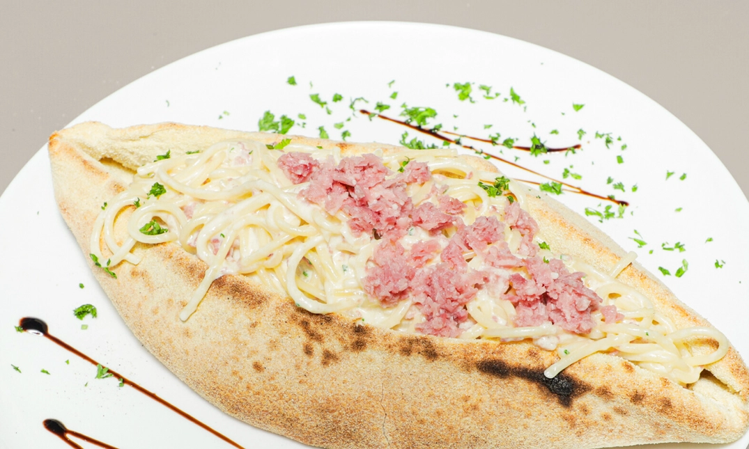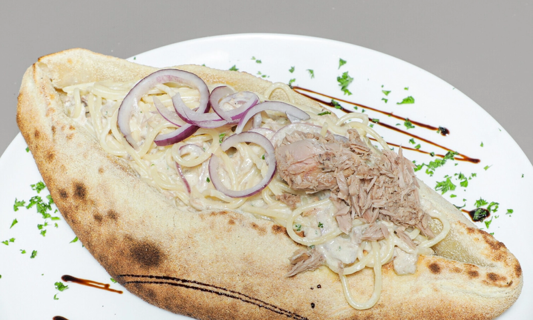Het is mogelijk om je pasta in een boot van deeg te laten serveren tegen een meerprijs van €4