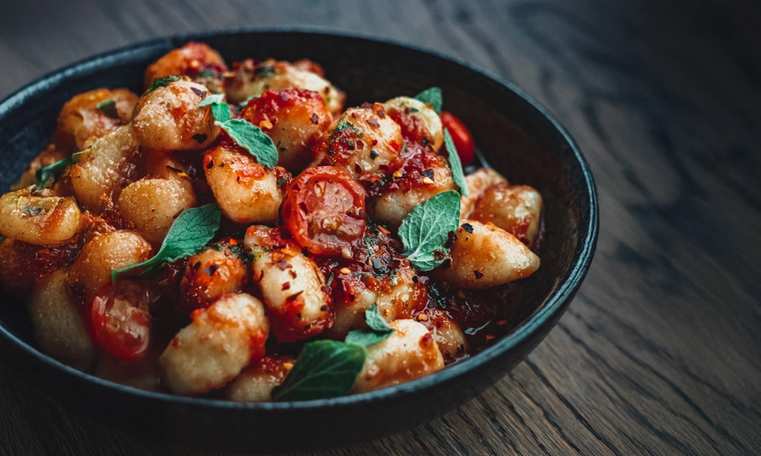 gnocchi in San Marzano-tomatensaus met geroosterde cherrytomaten, knoflook, rozemarijn, peperoncino, oregano en gremolata - Bolognese