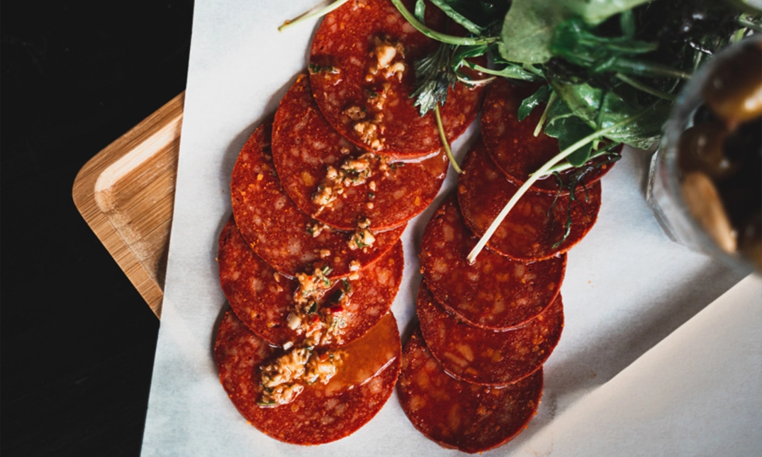 met tomatensaus, huisgemaakte kaas, pittige rozemarijn-knoflookolie, paprika, vegan "salami", rode ui en tuinkers - Fungky
