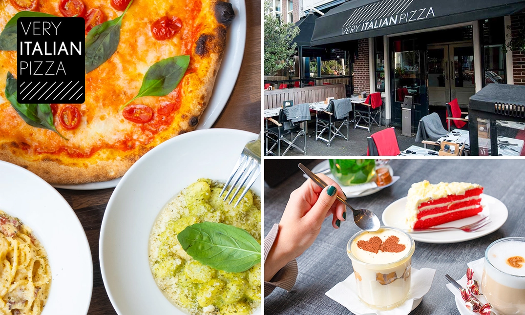 Laat je in de Italiaanse watten leggen met een 2-gangenlunch of 3-gangendiner à la carte bij Very Italian Pizza in hartje Den Haag: of ga voor een Dudok-taartje met koffie of thee